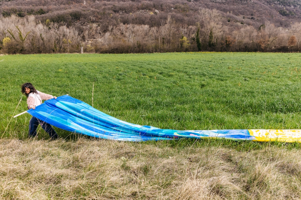 “Si la peinture d’Erika Schwinte est une affaire de sensations et de réponses, elle s’inscrit dans une histoire de la peinture abstraite. On pense à la nécessité intérieur de Kandinsky, notion que l’artiste développe lors de son passage à l’abstraction dans des toiles inspirées précisément du paysage. On pourrait également songer à l’expressionnisme abstrait face à ces grandes surfaces où la couleur se dépose par accumulation de gestes. Joan Mitchell qui déclarait qu’elle peignait des paysages remémorés, les sentiments qu’ils lui ont inspirée, visait aussi cette recherche sensible d’un équivalent pictural. A cette généalogie, s’ajoute chez Erika Schwinte la recherche d’un certain dépouillement qui se traduit dans la matérialité brut du support laissé apparent par endroit ou par l’utilisation de la toile libre. Cette simplicité des moyens traduit une forme d’immédiateté, une immédiateté de la peinture, dans ce qui la sollicite comme dans ce qu’elle transmet au regard.”